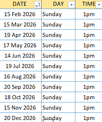 Usually 2nd or 3rd Sunday of each month at 1pm
